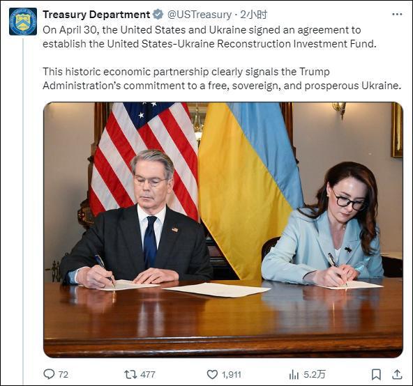 4月30日,美乌签署矿产协议 美国财政部X平台账号