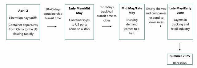 按其时间表所述,第一波次将在5月上旬至中旬发生。在经历三个阶段后,在2025年夏季,美国经济陷入衰退,具体“四步走”的阶段如下: