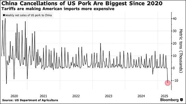 美媒援引美农业部上周四(24日)发布的数据称,中国取消了1.2万吨美国猪肉的采购订单,较前一周暴跌72%,创下今年迄今最低单周交货量记录。同时,这也自2020年以来,中国取消美国猪肉订单的最大规模。