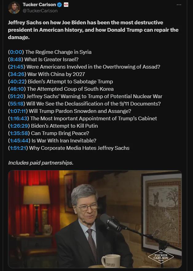 如下图所示,在这段塔克·卡尔森于北京时间12月17日早上6时46分发布在其个人社交账号上的访谈中,接受他采访的美国经济学家杰弗里·萨克斯在访谈视频第34分26秒左右,开始谈论起了美国一些政客炒作“中美冲突”的话题。