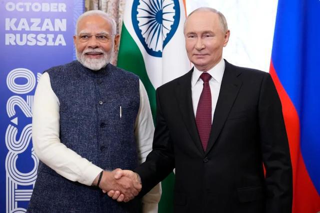 2024年10月22日,俄总统普京(右)与印度总理莫迪在出席俄罗斯喀山金砖峰会期间举行会晤 美联社