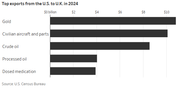 英国作为主要的北欧石油贸易中心,在2024年,美国向英国出口了约147亿美元的石油、天然气和各种矿物燃料,约占对英出口额的18%。