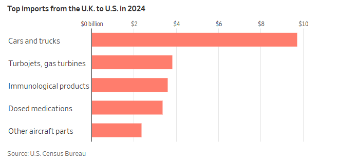 汽车是美国去年从英国进口规模最大的商品,总额达97亿美元,占2024年英国对美出口商品总额的14.3%。