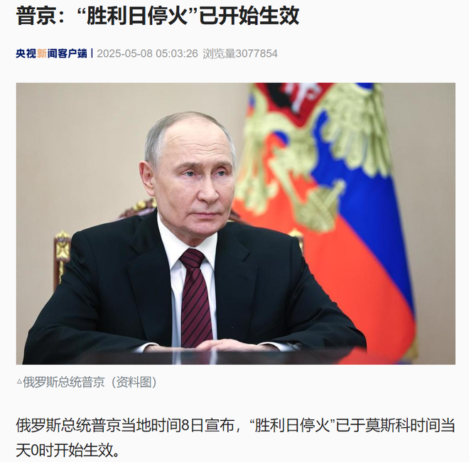 俄罗斯总统普京当地时间8日宣布,“胜利日停火”已于莫斯科时间当天0时开始生效。