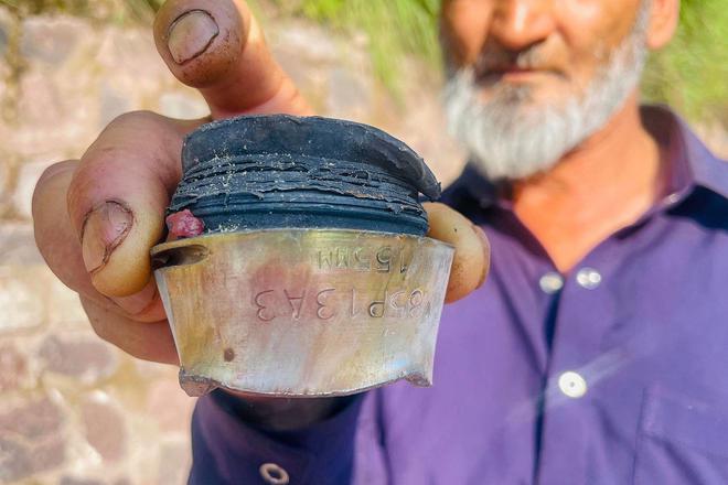 ▲当地时间5月10日,巴控克什米尔查克霍提村,一名居民展示一枚炮弹碎片 图源/视觉中国