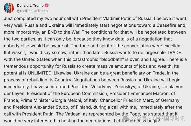 特朗普在社交媒体发文说,他刚刚同普京结束2个小时的通话,通话“挺顺利”。“俄乌将立即启动旨在实现停火的谈判,更重要的是,这是旨在结束战争的谈判。具体条件将由双方协商确定,因为他们掌握着其他人无法知晓的谈判细节”。