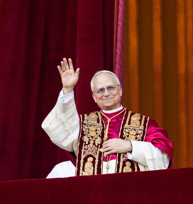5月8日,在梵蒂冈城,来自美国的枢机主教罗伯特·普雷沃斯特当选新一任天主教罗马教皇后向民众致意