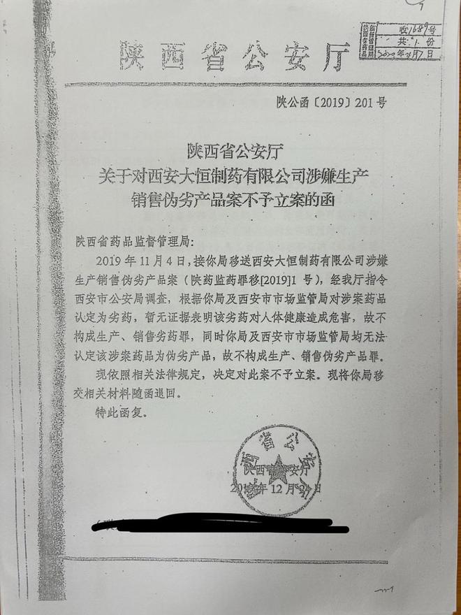 关于上述公安机关不予立案之内容,一审法院审理时查明, 2019年12月24日,陕西省公安厅向陕西省药监局作出《关于大恒制药公司涉嫌生产销售伪劣产品案不予立案的函》,称“经我厅指令西安市公安局调查,根据你局及西安市市场监管局对案涉药品认定为劣药,暂无证据表明该劣药对人体健康造成危害,故不构成生产、销售劣药罪,同时你局及西安市市场监管局均无法认定案涉药品为伪劣产品,故不构成生产、销售伪劣产品罪”,决定不予立案,将移交相关材料随函退回。