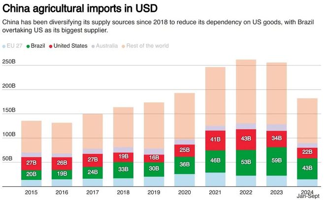 路透社此前引述中国海关数据称,2024年中国从美国进口的大豆份额已经从2016年的40%降至18%,而巴西进口所占的份额从46%增至76%;玉米进口情况亦然。