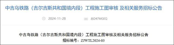11月28日,中国铁路国际有限公司吉尔吉斯分公司在“国铁采购平台” 发布了《中吉乌铁路(吉尔吉斯共和国境内段)工程施工图审核及相关服务招标公告》。根据项目概况,吉国境内段线路全长304.94km,计划投资338.8亿元,建设总工期6年。