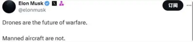 在当地时间6月1日乌克兰使用无人机对俄罗斯发起大规模袭击后,美国企业家马斯克在社交平台上发文称,“无人机是战争的未来,而不是有人驾驶飞机”。