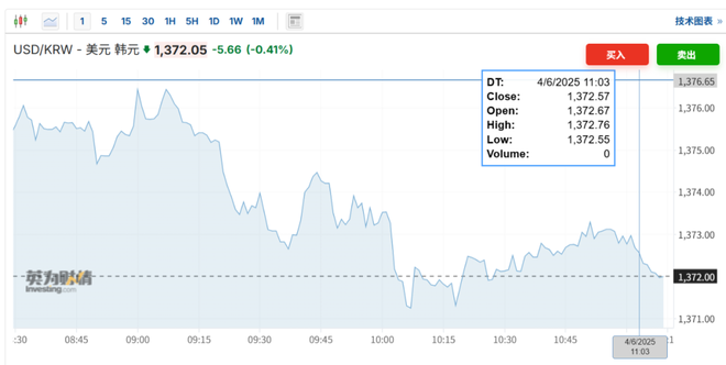 韩元兑美元上涨,目前报1372.05。