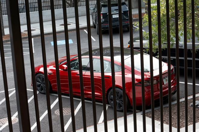 当地时间6月5日,特朗普的特斯拉停在白宫大道上