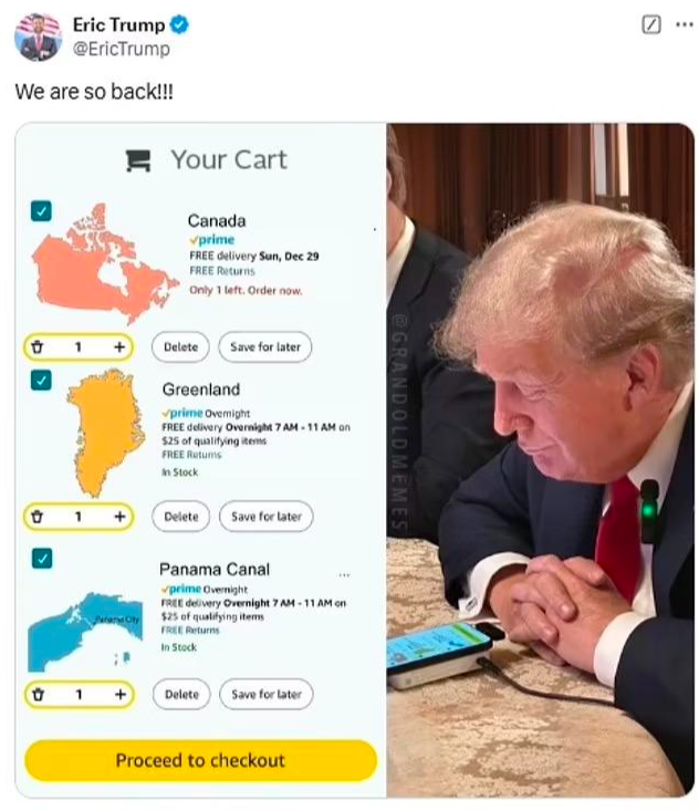 24日,特朗普次子埃里克·特朗普在社交媒体上发布了一张模拟亚马逊购物车的图片,其中将加拿大、格陵兰岛和巴拿马运河列为“商品”,并附了一张其父微笑注视着购物车的照片,配文称:“我们回来了!”