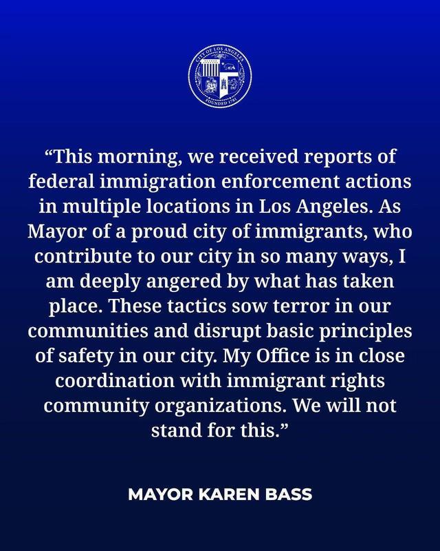 洛杉矶市市长卡伦·巴斯此前发表声明谴责联邦机构对非法移民的大肆搜捕行为