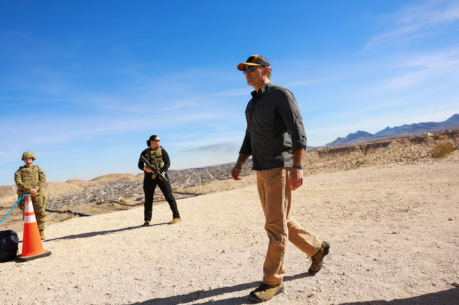 当地时间2月3日,美国防长赫格塞思在访问位于美墨边境的新墨西哥州桑兰公园期间与美国军事人员会面