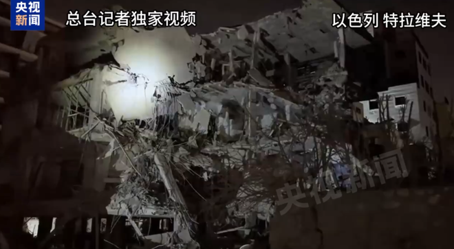 总台记者 赵兵:我身后的这栋建筑,它的侧立面已经几乎完全被破坏,整栋建筑受损也非常严重。我手指的方向,还有一栋四层的建筑。当地以色列相关作业人员告诉我,那里应该是导弹袭击的第一落点。我们看到四层建筑的整个房顶已经坍塌,基本成了残垣断壁。以色列急救人员告诉我们,他们当时从附近的这几栋楼里,急救了至少30名的伤员,有很多人都是从废墟之下被救出的。