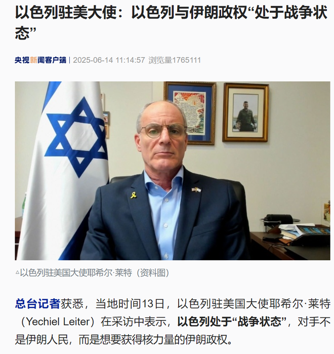 总台记者获悉,当地时间13日,以色列驻美国大使耶希尔·莱特(Yechiel Leiter)在采访中表示,以色列处于“战争状态”,对手不是伊朗人民,而是想要获得核力量的伊朗政权。