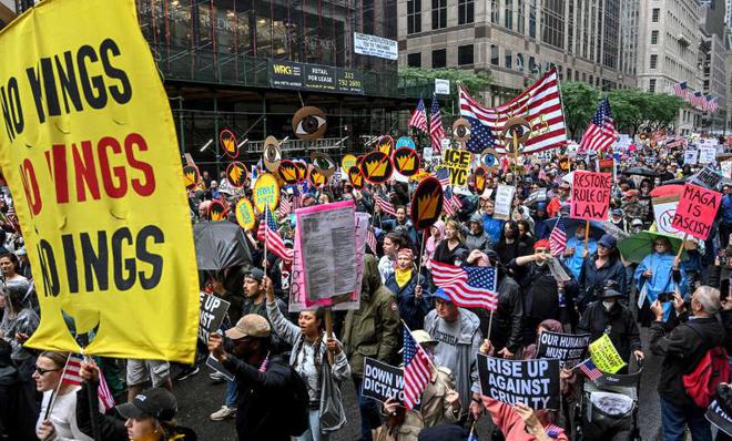 在包括洛杉矶、纽约、丹佛、芝加哥、奥斯汀在内的多地,庞大而喧闹的人群肩并肩地游行、跳舞、敲鼓并呼喊着口号,一些人举着“不要国王”的横幅。