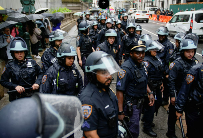 6月14日,纽约市举行抗议活动,纽约警察局的警员正在等待指令 图源:美媒