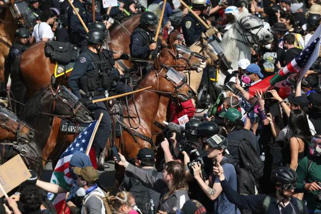 当地时间6月14日,美国骑警驱散抗议者 图源:美媒