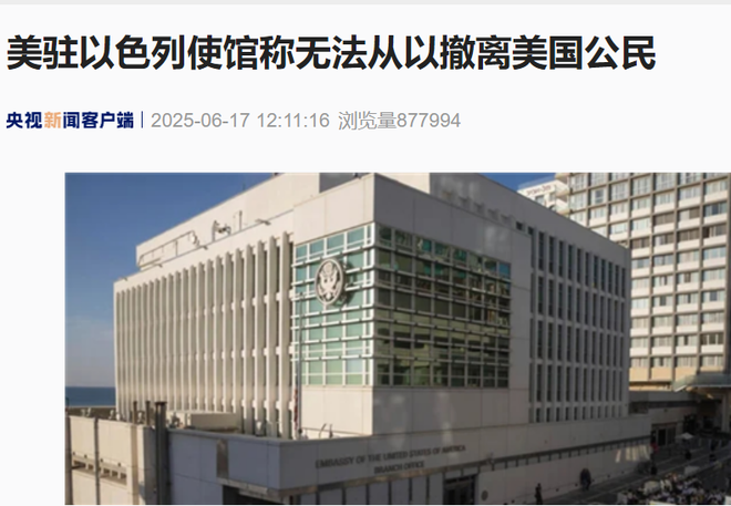 据央视新闻,当地时间6月17日上午,美国驻以色列大使馆表示,目前的条件不允许美国从以色列撤离其公民。图为央视报道截图当地... 据央视新闻,当地时间6月17日上午,美国驻以色列大使馆表示,目前的条件不允许美国从以色列撤离其公民。