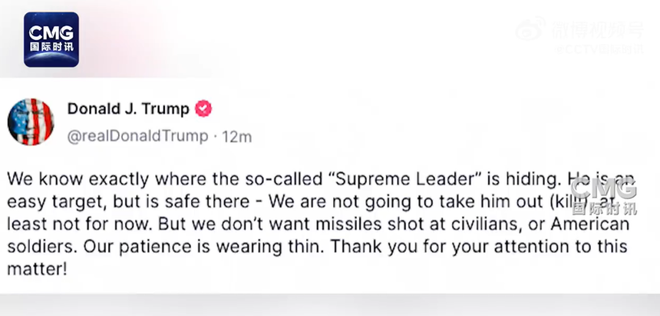 当天,特朗普在社交媒体发文,呼吁“无条件投降”。特朗普称,“美国确切知道伊朗最高领袖哈梅内伊身处何处,目前美国不会刺杀他,但美国不希望导弹袭击平民或美军。”特朗普称,“我们的耐心正在耗尽。”