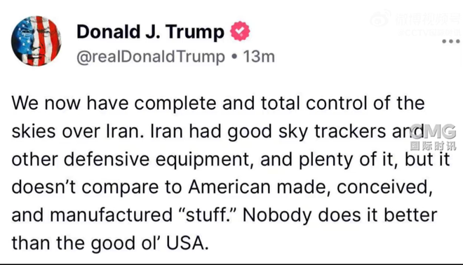 特朗普还发文称,“我们现在已完全控制了伊朗领空。”目前暂不清楚特朗普所说的“我们”是指谁。