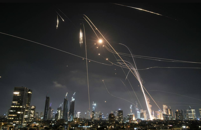 特拉维夫反导拦截作战的延时摄影,可以看见数枚伊朗弹头在被击中以后解体 社交媒体
