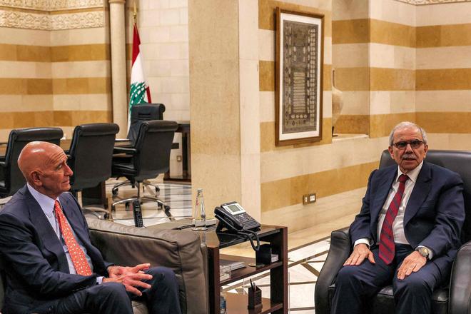 当地时间6月19日,黎巴嫩总理纳瓦夫·萨拉姆(右)在政府大楼会见美国叙利亚问题特使汤姆·巴拉克。巴拉克于当日警告真主党,不要卷入伊朗与以色列之间的战争 图据视觉中国