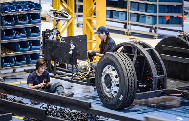 当地时间2023年11月14日,巴西圣保罗州,工人们在比亚迪太阳能电池板和电动巴士底盘生产工厂组装底盘(图片来源:视觉中国)