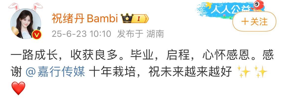 演员祝绪丹在微博发文告别公司嘉行传媒:一路成长,收获良多