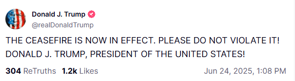 美国东部时间24日凌晨1时许,美国总统特朗普在社交媒体发布消息称,“停火现已生效,请勿违反。”