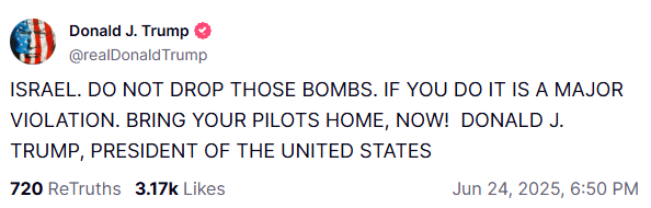 此外,特朗普还在社交媒体发文称,“以色列,不要投那些炸弹。如果这样做,那就是严重违规行为。让你们的飞行员回家!马上!”
