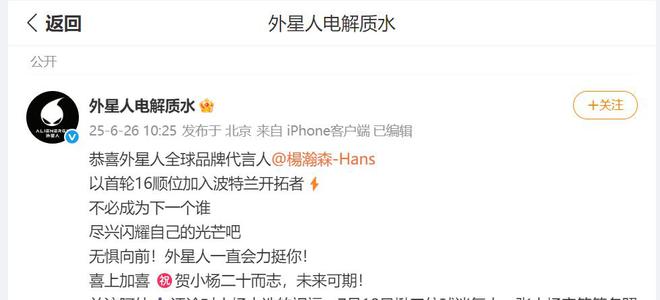 外星人电解质水官宣杨瀚森为代言人