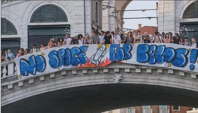 从上周开始,大批活动人士就开始在威尼斯持续组织各种抗议,公开抵制贝索斯的此次婚礼。在威尼斯各大标志景点,到处都可以见到带有贝索斯闪亮光头的标语。在Rialto桥和婚礼举办的小岛教堂,抗议者悬挂横幅“这不是贝索斯的地方”;抗议者高喊“贝索斯滚出威尼斯”“纳税不是慈善”,讽刺其用“环保捐赠”粉饰形象,却动用上百架私人飞机、封岛办婚礼,污染和排场给本地人和自然环境带来巨大灾难。