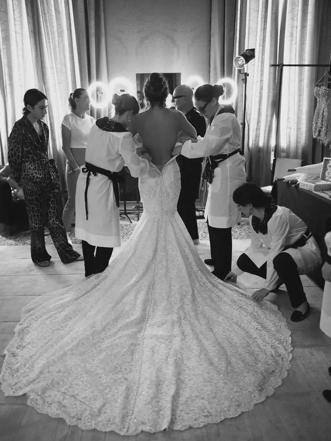 一反桑切斯过往的高调着装,这套来自杜嘉班纳的婚纱,除了尽显曲线之外,画风出人意料地“保守”。
