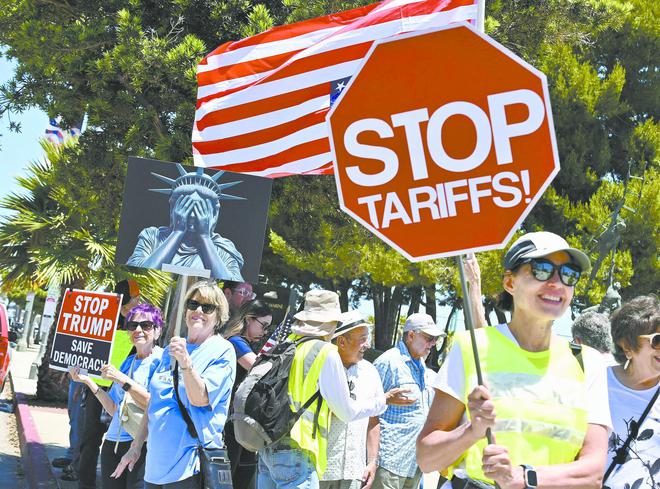 28日,美国加州圣佩德罗市的居民举行抗议活动,反对联邦政府的关税政策 视觉中国
