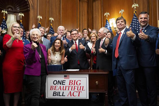 当地时间7月3日,“大而美”法案通过后,美国国会众议院议长约翰逊和众议院共和党人在法案登记仪式上竖起大拇指(图据视觉中国... 当地时间7月3日,“大而美”法案通过后,美国国会众议院议长约翰逊和众议院共和党人在法案登记仪式上竖起大拇指(图据视觉中国)