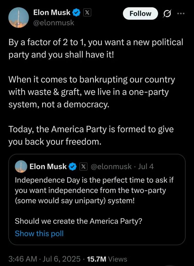 而马斯克在履行承诺之前,也玩了一把“探看民意”。在“大而美”法案由特朗普签署成法前几个小时,马斯克再次在社交平台上发布有关建立新党派的投票,问网民是否应该成立“美国党”,要把美国民众从民主党、共和党轮流上台的两党体制中“解放出来”。