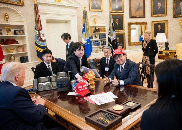 当地时间2025年4月16日,美国总统特朗普在白宫椭圆形办公室会见日本首席贸易谈判代表、经济再生担当大臣赤泽亮正 路透社
