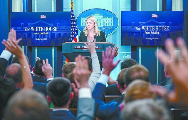 7月7日,华盛顿,白宫新闻发言人卡罗琳·莱维特出席记者会。美国总统特朗普当天宣布,将从8月1日起对来自日本、韩国等14个国家的进口产品征收25%至40%不等的关税 视觉中国