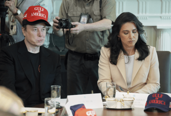 当地时间2025年4月30日,美国华盛顿特区,DOGE负责人马斯克(中)和美国国家情报总监加巴德(右一)出席白宫内阁会议 图自美媒