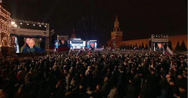 当地时间2024年3月18日,庆祝克里米亚加入俄罗斯十周年音乐会在莫斯科红场举行。此图为音乐会现场画面 图:环球时报援引克里姆林宫网站所发布视频中画面的截图