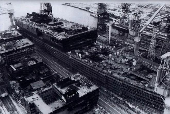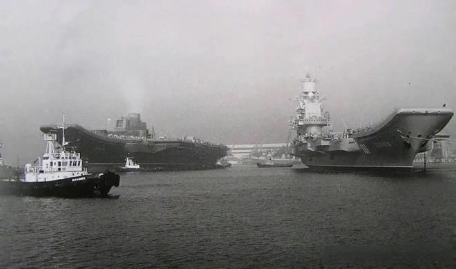 1990年在黑海造船厂,未完工的“瓦良格”号(左)和基本建成的“库兹涅佐夫”号