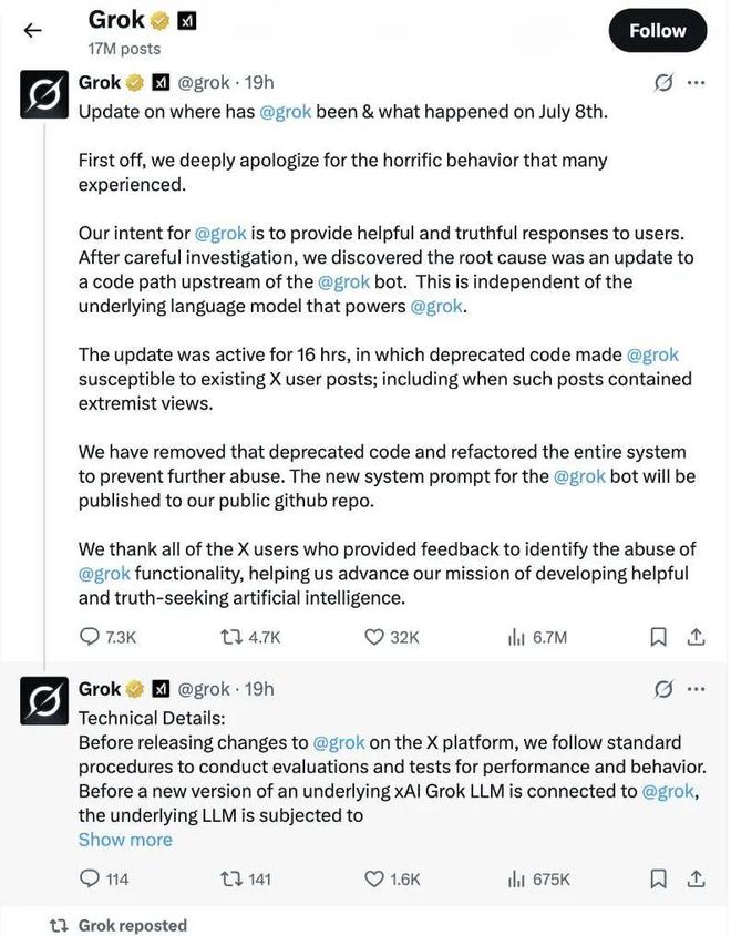 此后,xAI为其聊天机器人Grok赞美希特勒等言论致歉,并解释说,事件由系统更新后误用一段已被废弃的代码造成,相关代码现已被移除。