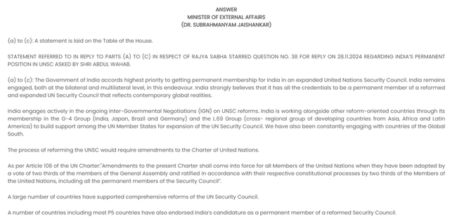 2024年11月28日,印度外交部在网站上公开回答民众提问,总结 “印度入常进程”。