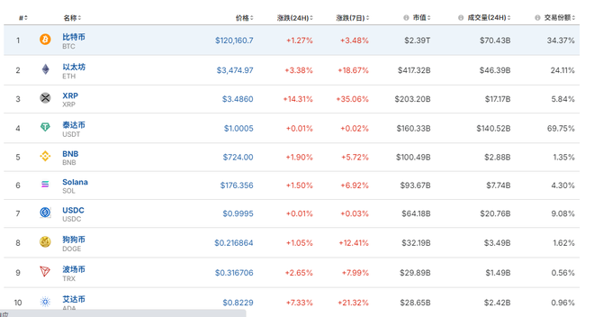 截至7月18日发稿,比特币报120160.7美元,涨幅1.27%;以太坊涨3.38%;XRP涨14.31%。