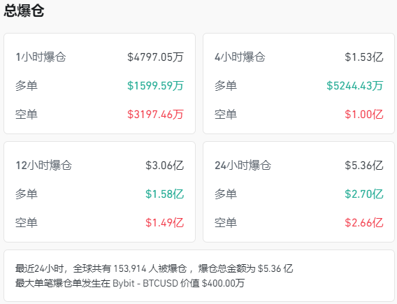 coinglass数据显示,近24小时爆仓总金额为5.36亿美元(约合人民币约39亿元),超15万人爆仓。