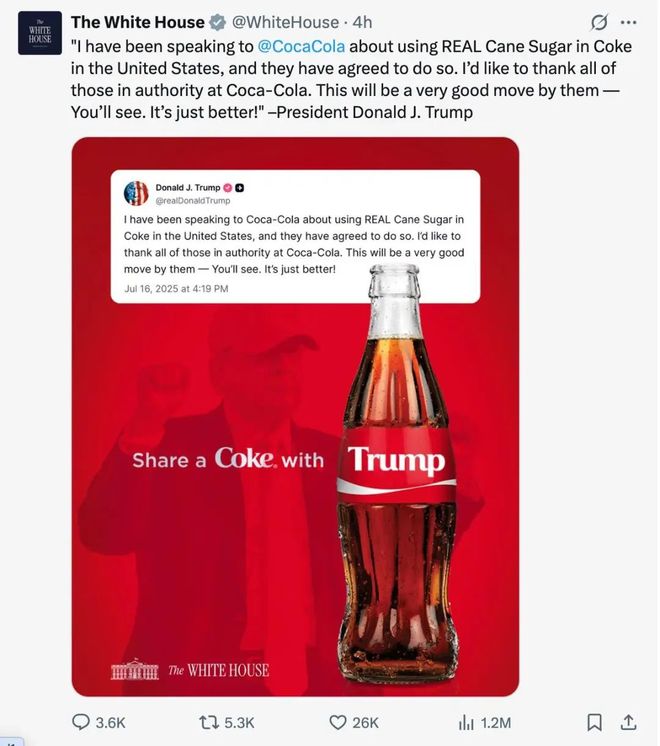 白宫社交媒体账号转发特朗普关于让在美销售可口可乐使用蔗糖帖文的截图 图:新华社
